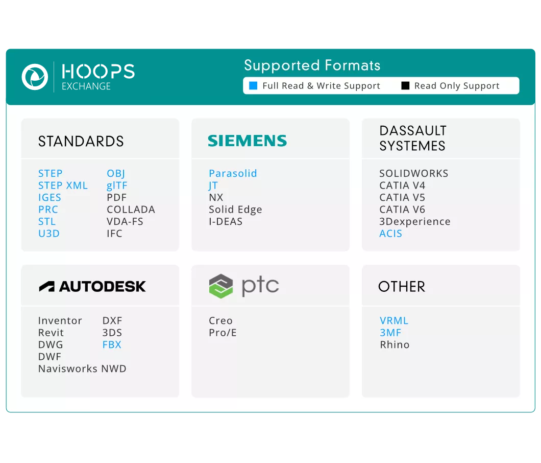 Import over 30 CAD file formats into your application with the HOOPS Exchange SDK for CAD data translation, featuring fast and accurate read and write support for 2D and 3D CAD file formats including CATIA®, SOLIDWORKS®, Inventor™, Revit™, Creo®, NX™, Solid Edge® and many more, all through a single API.