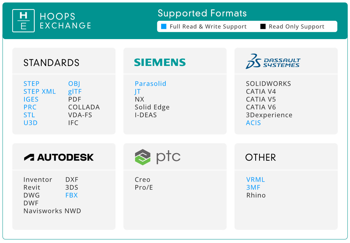 The HOOPS Exchange SDK is a set of software libraries that provide developers with the ability to read and write popular 2D and 3D formats from within their application. HOOPS Exchange reads CAD data from the most popular 3D file formats and converts that 3D data to the PRC data format, a highly compressible and open file format that is ISO certified. PRC is also one of the container formats used for 3D in Adobe PDF.