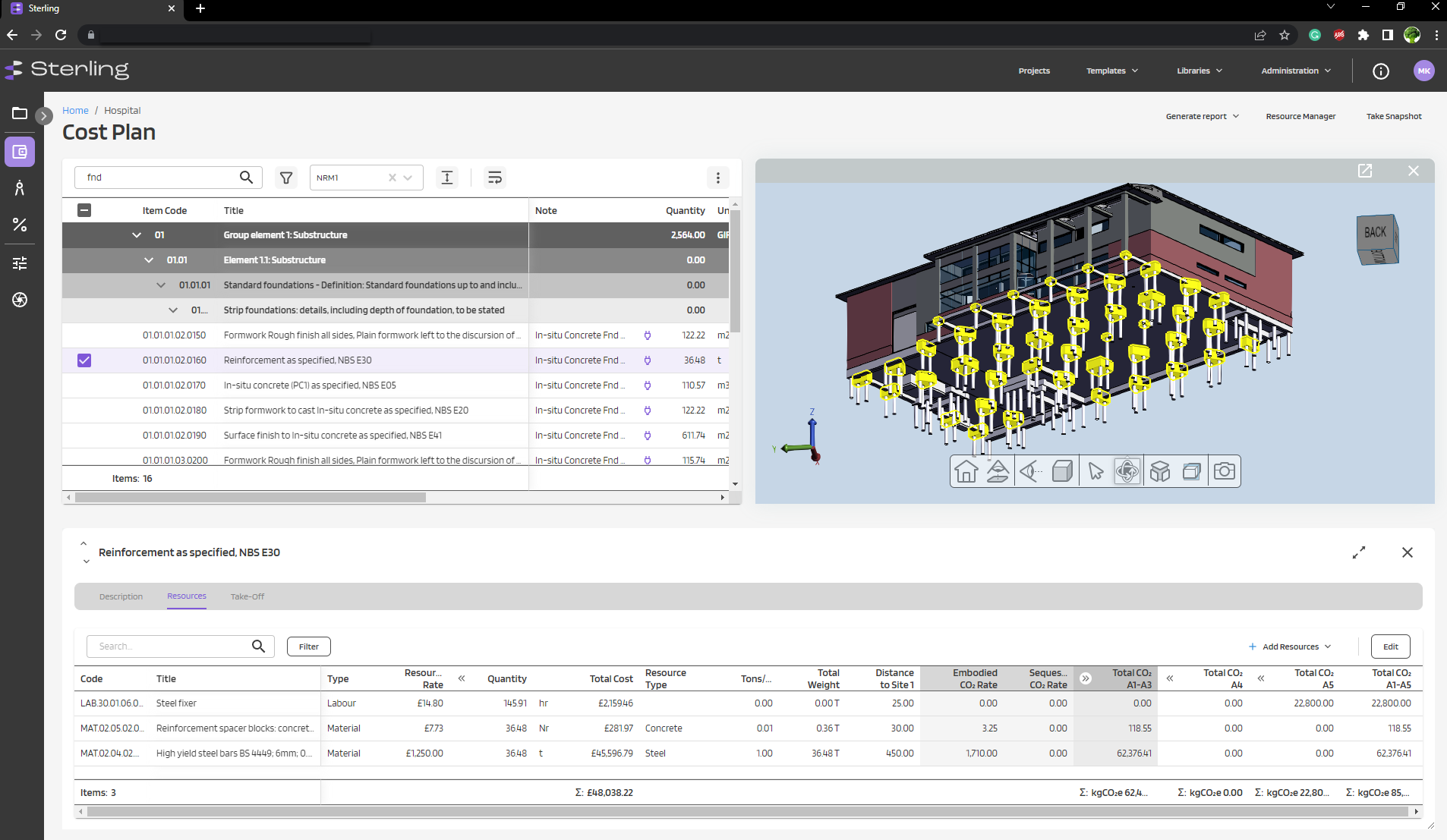 Once all the data is in Sterling, customers can start the cost estimating and carbon calculation. They do this by taking advantage of 2D/3D digital take-off tools that can quickly extract useful measurements and attributes for use in calculations.